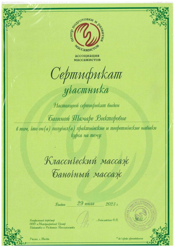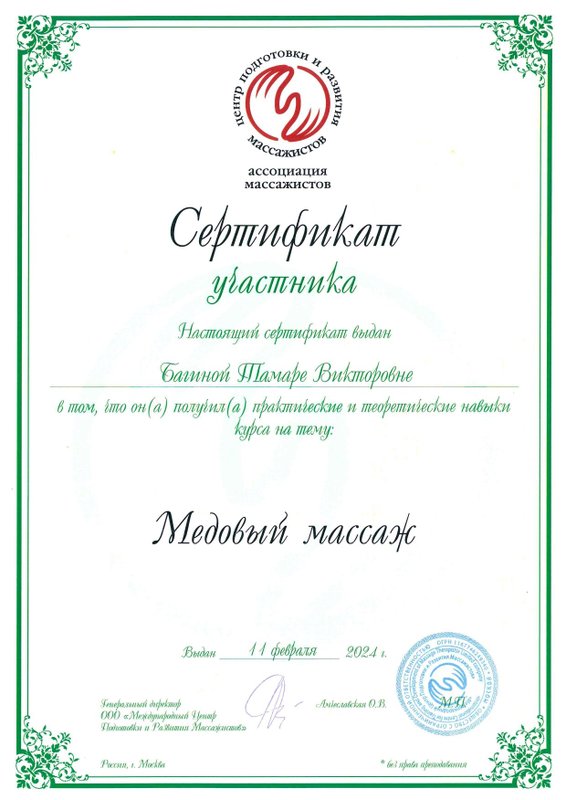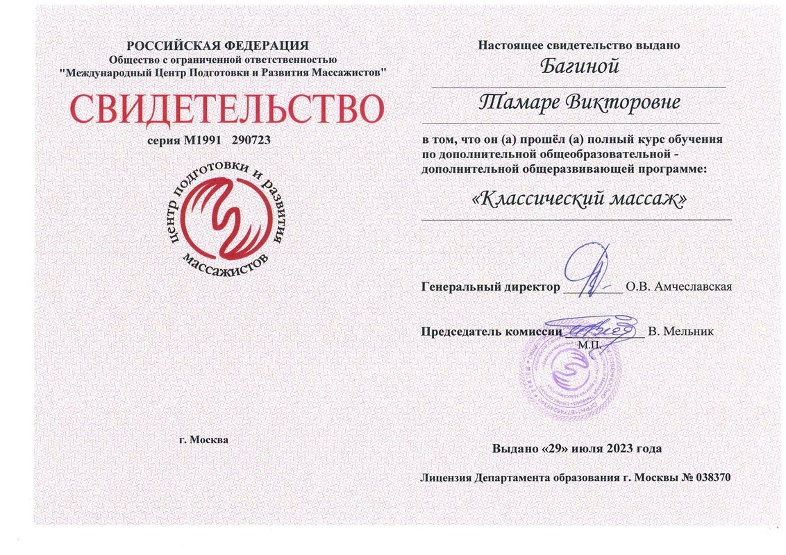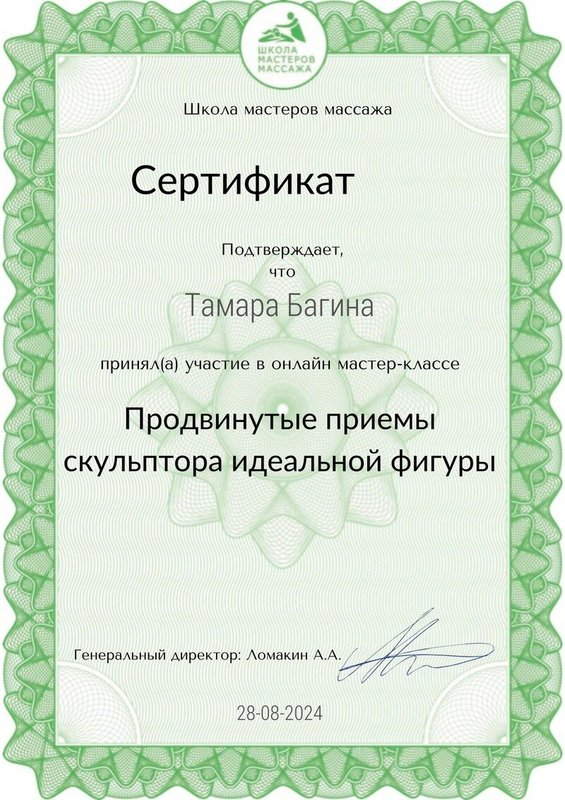 Специалист Тамара Багина работает как массажист. Улучшить самочувствие можно многими способами, и массаж - один из наиболее приятных. Специалист сможет привести в тонус уставшие мышцы или, наоборот, расслабить слишком напряженные участки тела. Тамара Багина как профессиональный массажист поможет вам оставаться в форме. Воздействуя на определенные зоны, она стимулирует приток крови в организме, что плодотворно влияет на работу многих систем. На сеансе вам предоставится возможность не просто укрепить мышцы тела, но и зарядиться бодростью на весь день. Тамара сделает все возможное, чтобы вы стали ее частым клиентом.